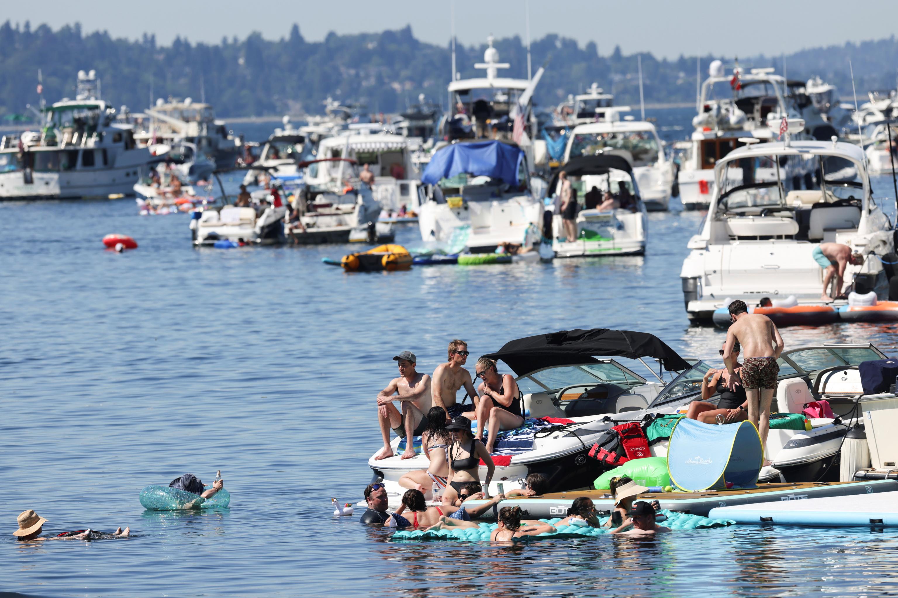 People party on boats off Seward Park on Lake Washington during a heat wave in Seattle, Washington, on June 26, 2021.