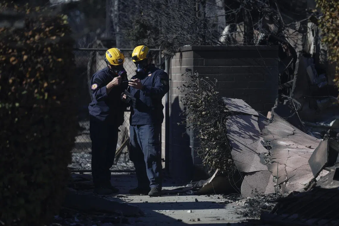 Firefighters and search and rescue teams inspecting the site of a burned down home in Altadena, California.