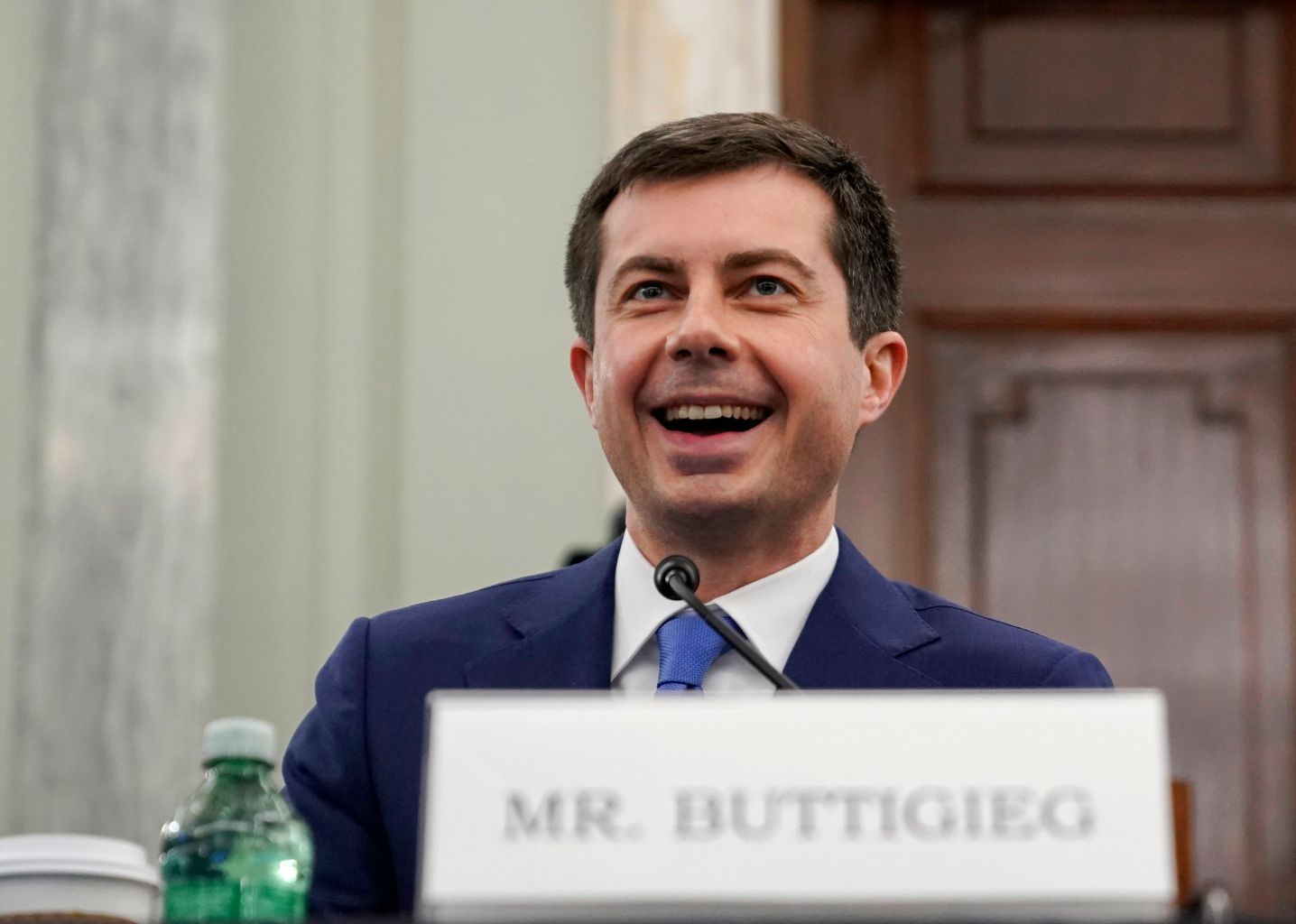 Pete Buttigieg smiles during a Senate confirmation hearing in Washington, DC..