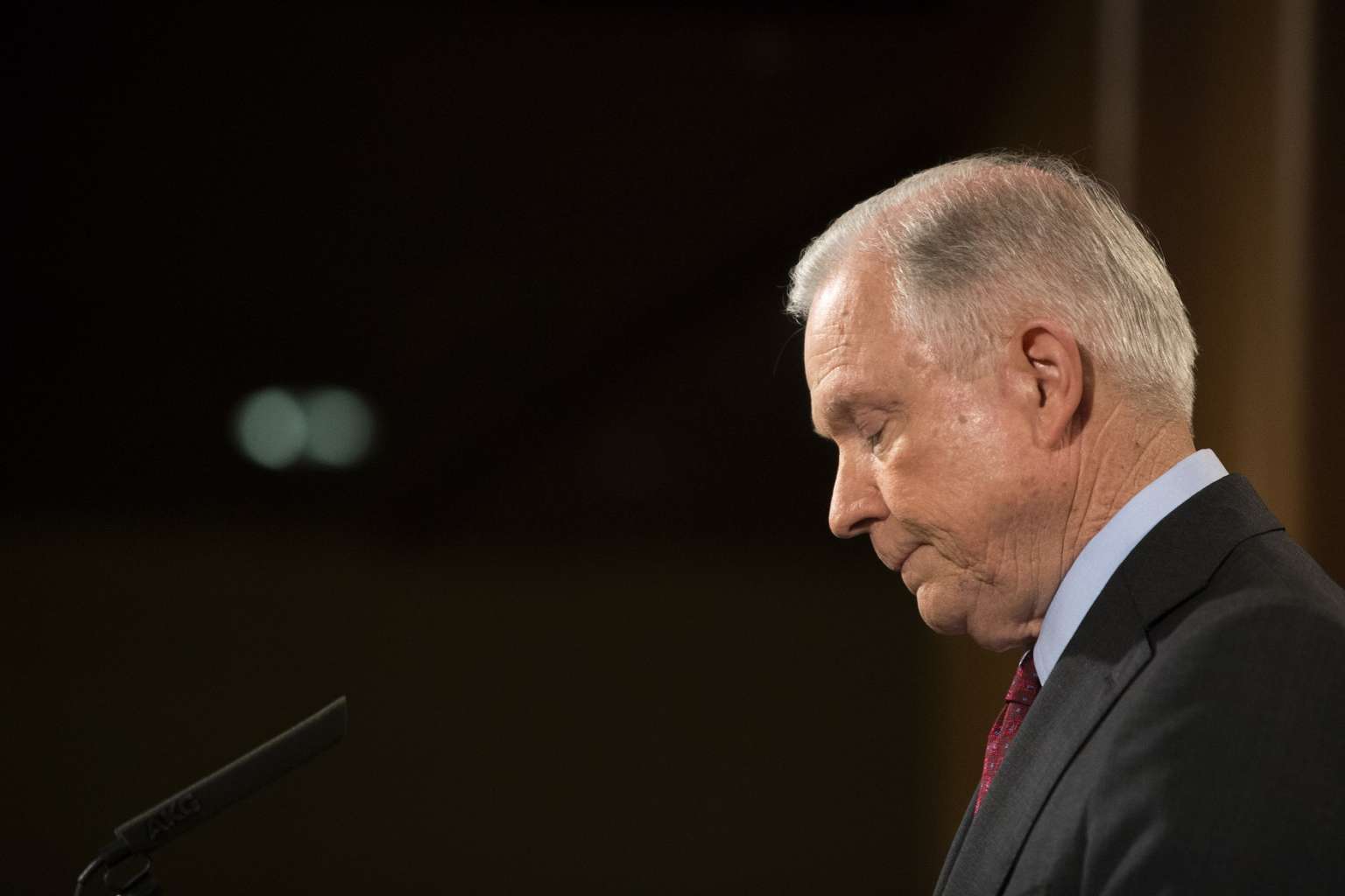 Attorney General Jeff Sessions gives a statement stating that he will continue to serve “as long as that is appropriate,” following comments from President Donald Trump, at the Department of Justice in Washington, on July 20, 2017.