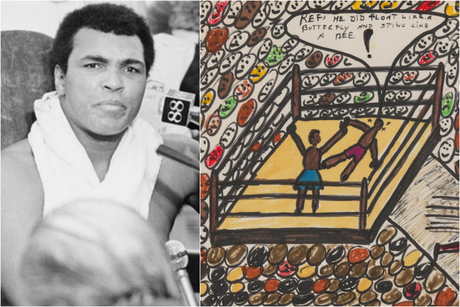 "Ref, he did float like a butterfly and sting like a bee!" reads the speech bubble from a boxer knocked out by an opponent whose arms are raised in victory. Ali famously used the phrase to describe his boxing style.