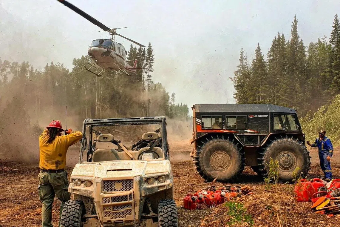 Firefighters, heavy equipment and aircraft create and strengthen control lines of the Bassett wildfire complex near Paddle Prairie Metis Settlement, Alberta, Canada.