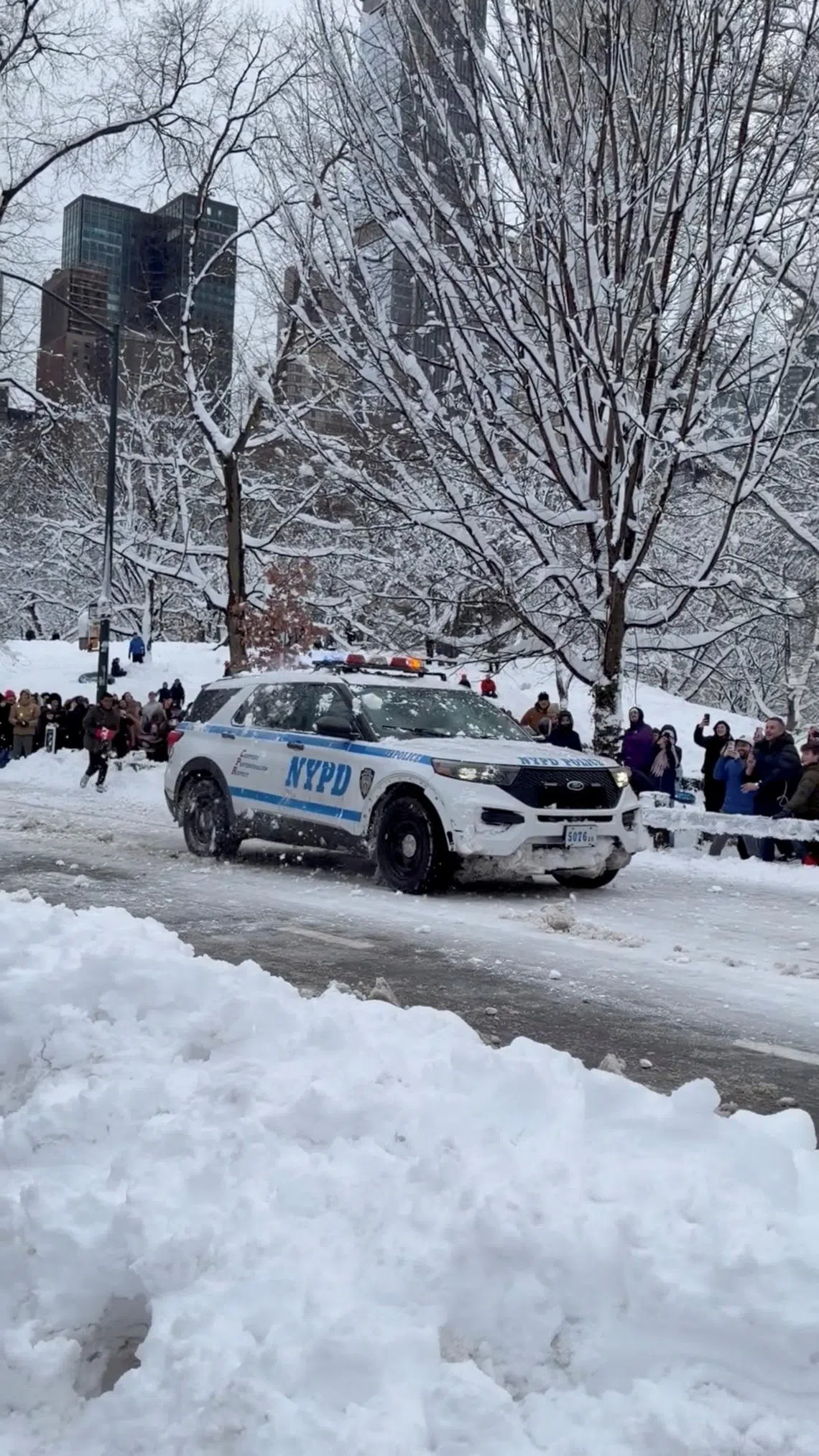 People throw snowballs at an NYPD vehicle in Central Park.