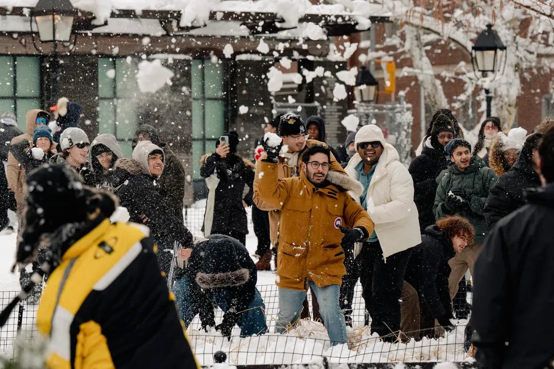 An organised snowball fight takes place in Washington Square Park on Feb 23.