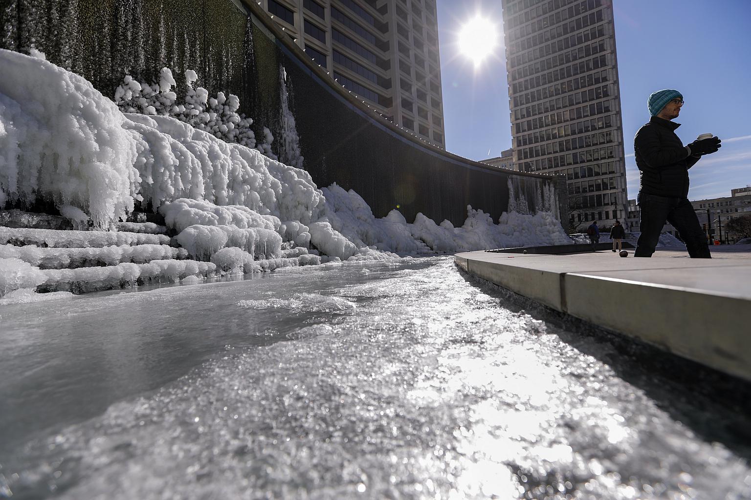 A man walks near a frozen fountain during a bitter cold spell in Atlanta, Georgia on Jan 5, 2018.