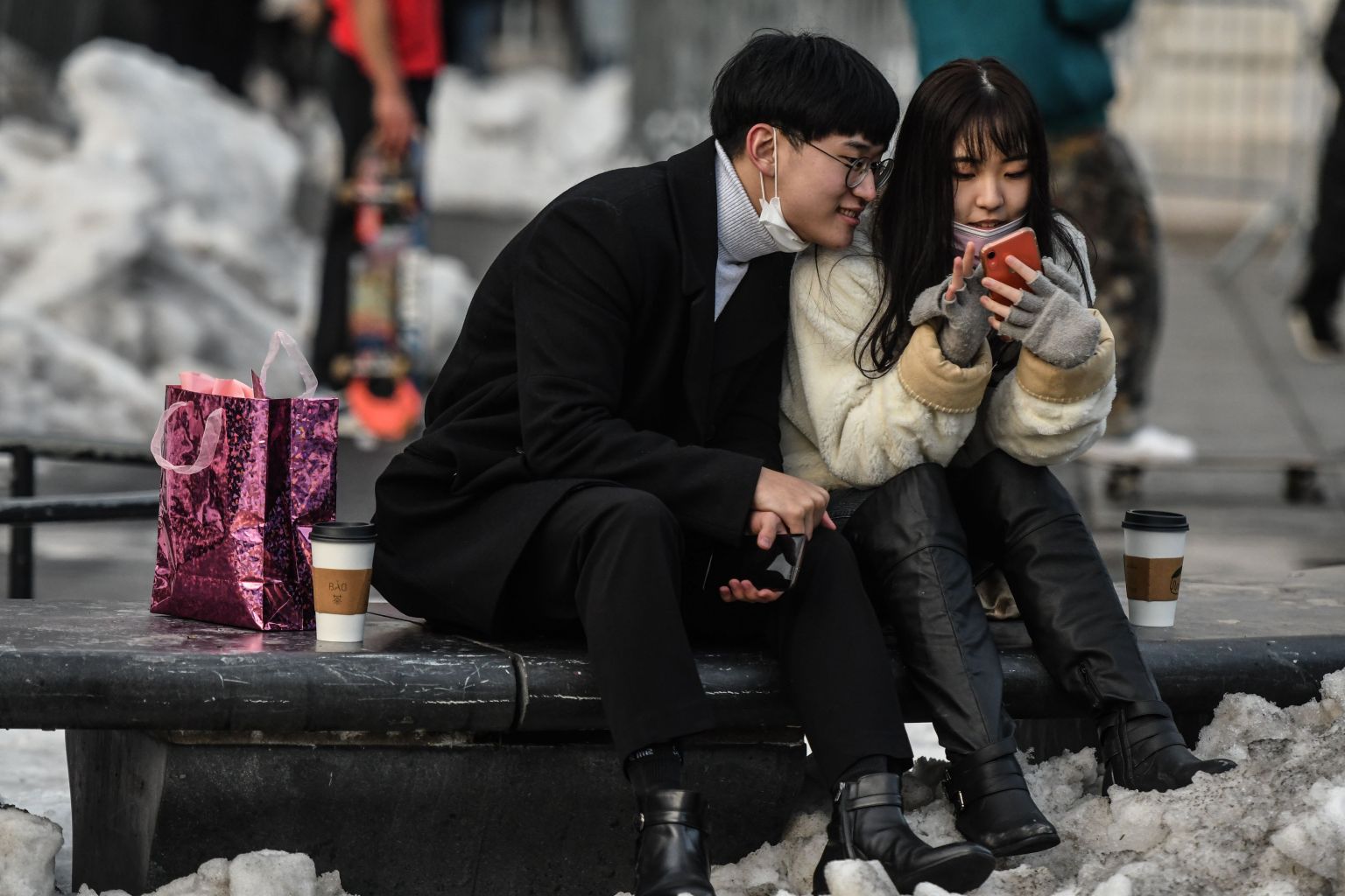 A couple looks at a mobile phone in Washington Square Park in New York, on Feb 14, 2021.