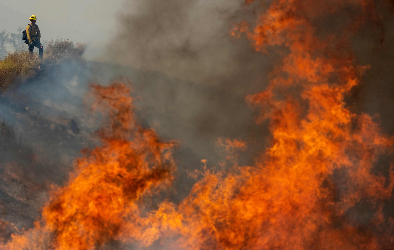A firefighter watches the flames crest a ridge during the Apple Fire near Banning, California, on Aug 1, 2020.
