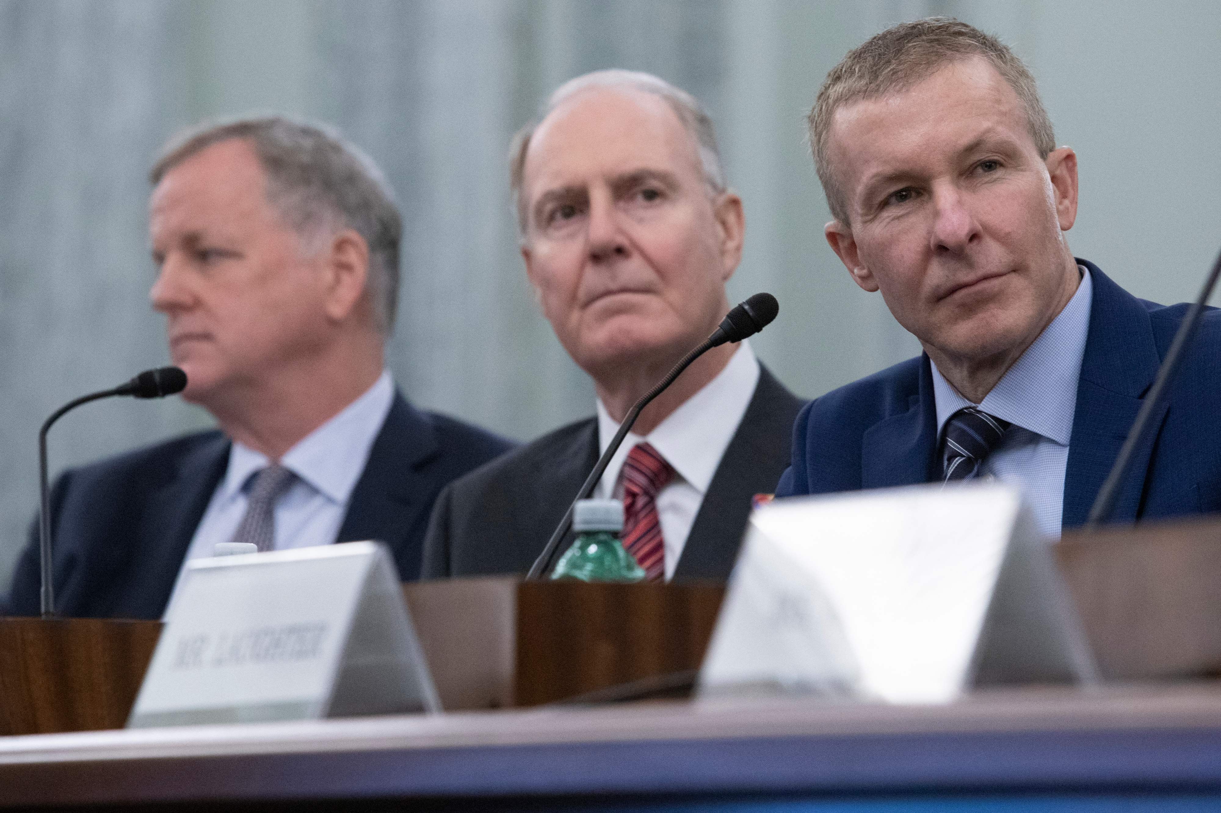 Southwest CEO Gary Kelly at the hearing (centre) with American Airlines CEO Doug Parker (left) and United Airlines president Scott Kirby.