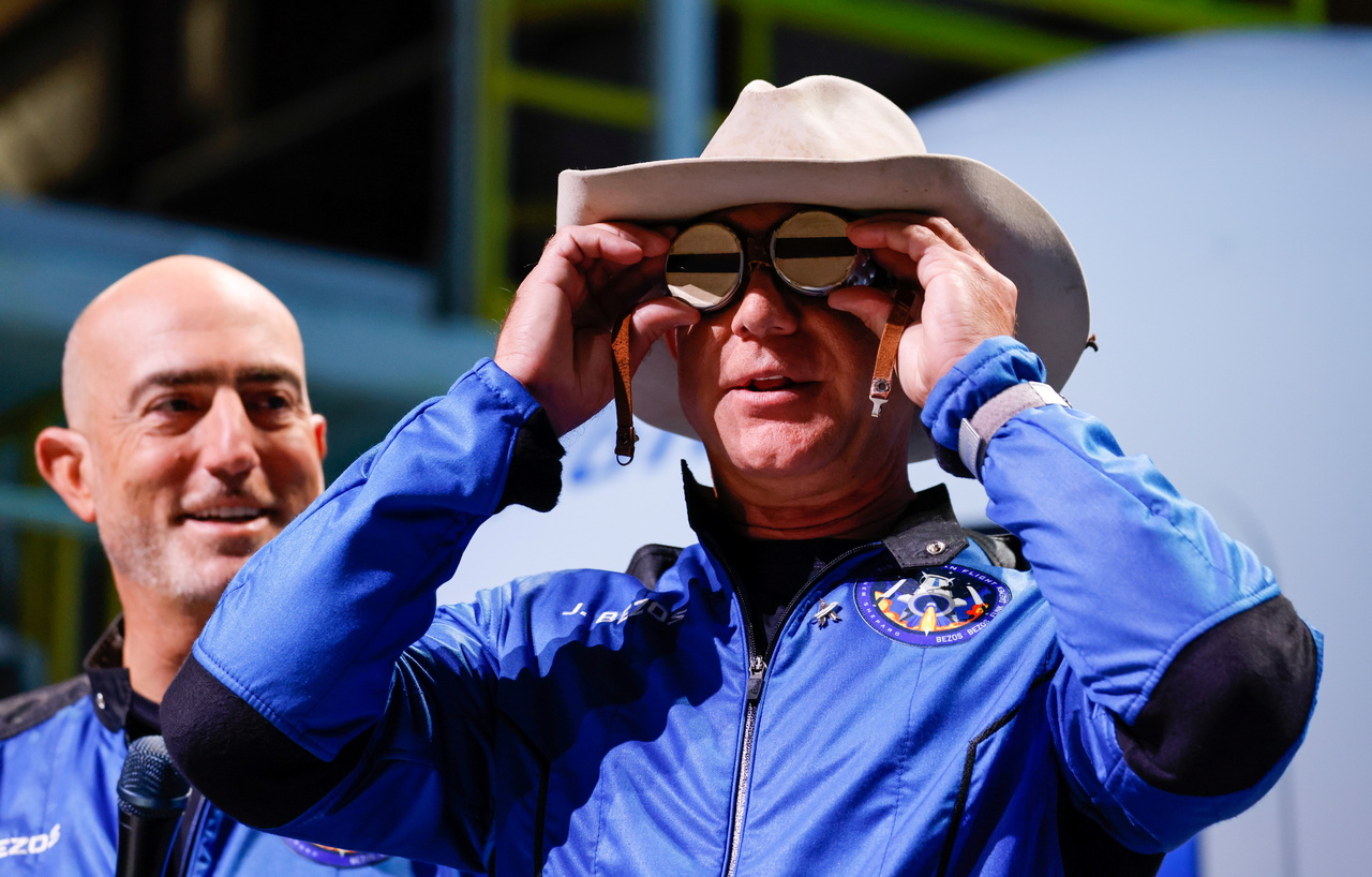 Blue Origin's Jeff Bezos sported a cowboy hat after landing and Mr Richard Branson wore a blue Virgin Galactic jumpsuit he had called "sexy".