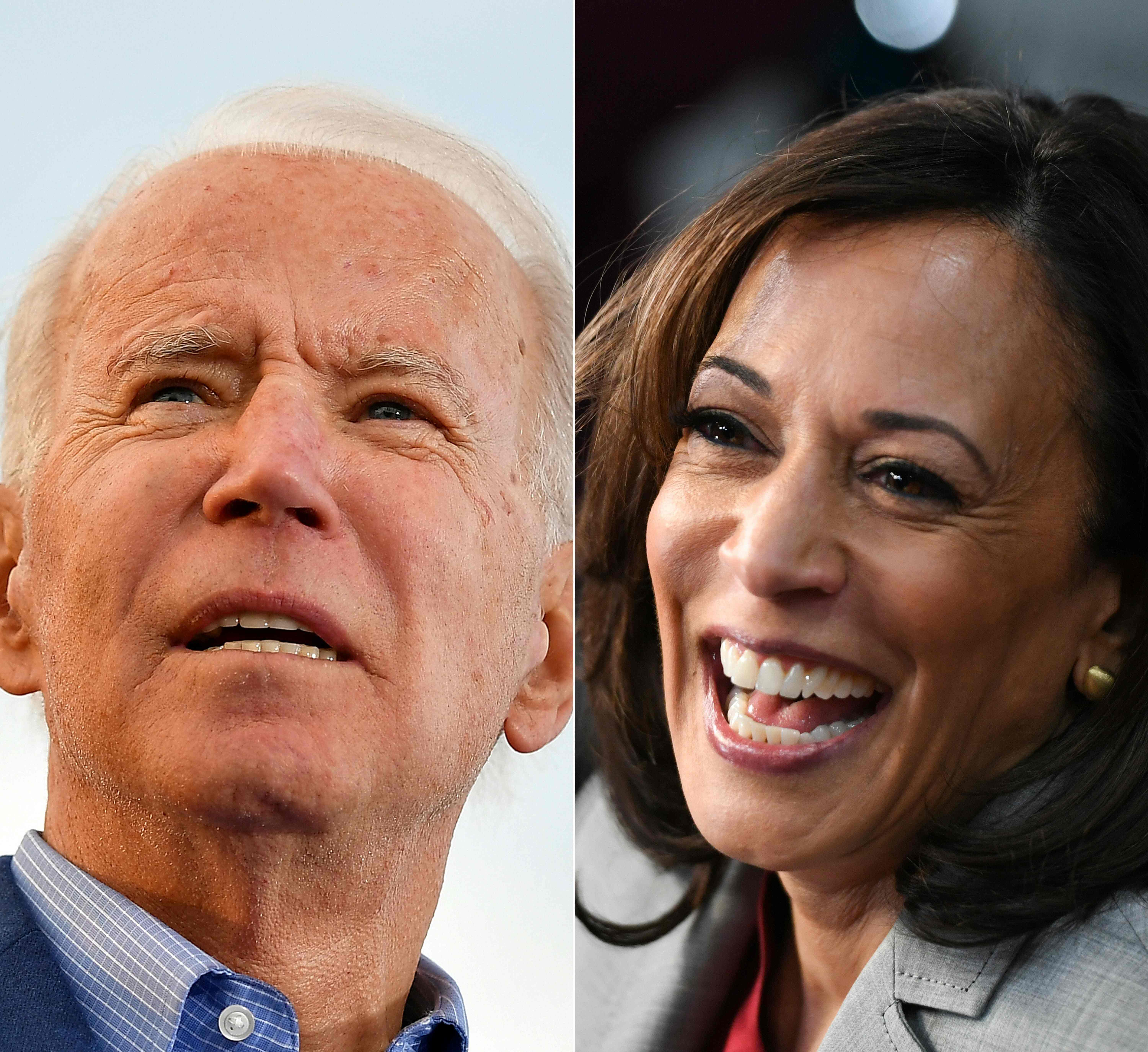 This combination of file photos created on March 8, 2020 shows Democratic presidential candidate former Vice President Joe Biden during a campaign rally at the WWI Museum and Memorial in Kansas City, Missouri on March 7, 2020, and former Democratic presidential hopeful California Senator Kamala Harris in the Spin Room after participating in the fifth Democratic primary debate of the 2020 presidential campaign at Tyler Perry Studios in Atlanta, Georgia on November 20, 2019.