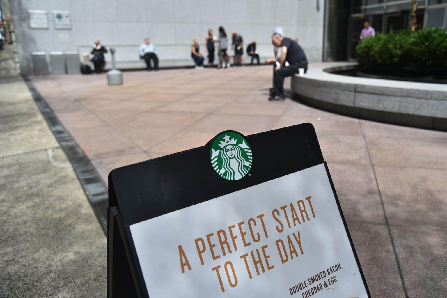 A sign for Starbucks is seen on a street in New York City on May 11, 2018.