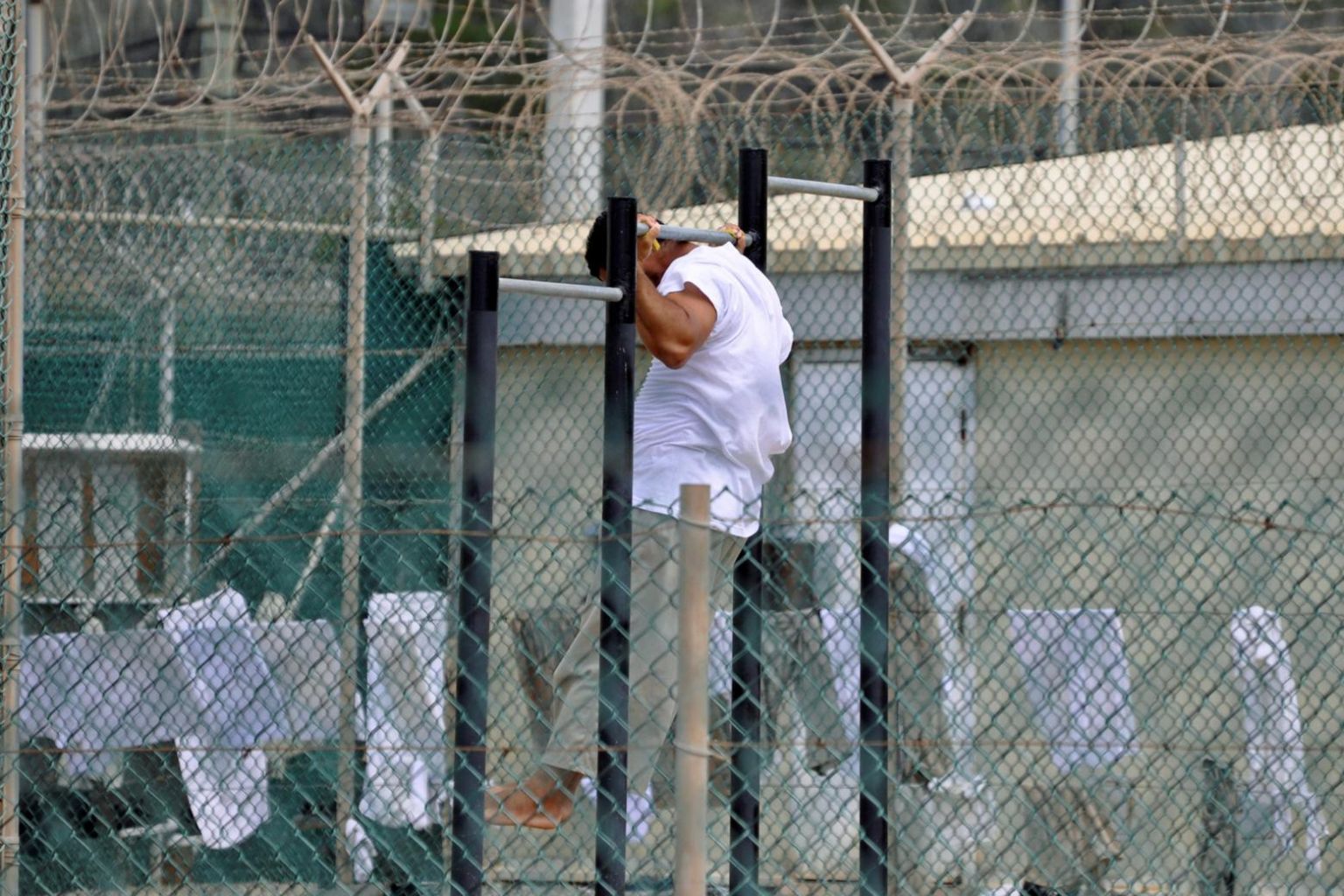 A Guantanamo Bay detainee does pull-ups inside an exercise area at the detention facility.