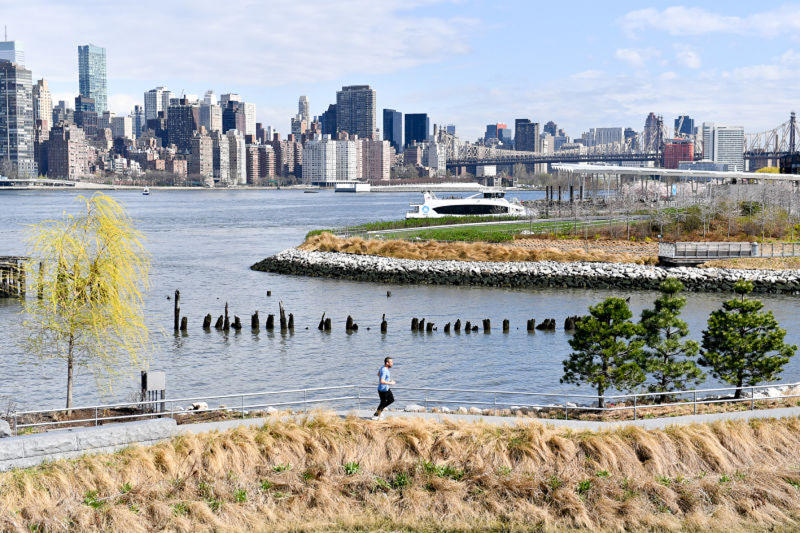 One of those parks, Hunter's Point South Park, sits on the edge of New York's East River. The park boasts rows of seasonal plants, winding paths, and breathtaking views. But that's not all: the flower beds disguise a ditch and filtration system that captures water and slowly releases it back into the river; synthetic turf absorbs water, too.