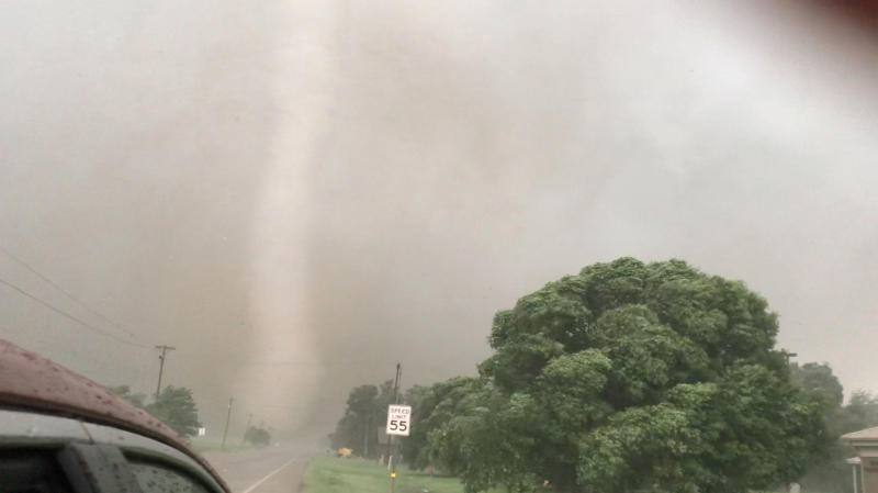 A tornado spins during stormy weather in Mangum, Oklahoma, on May 20, 2019.