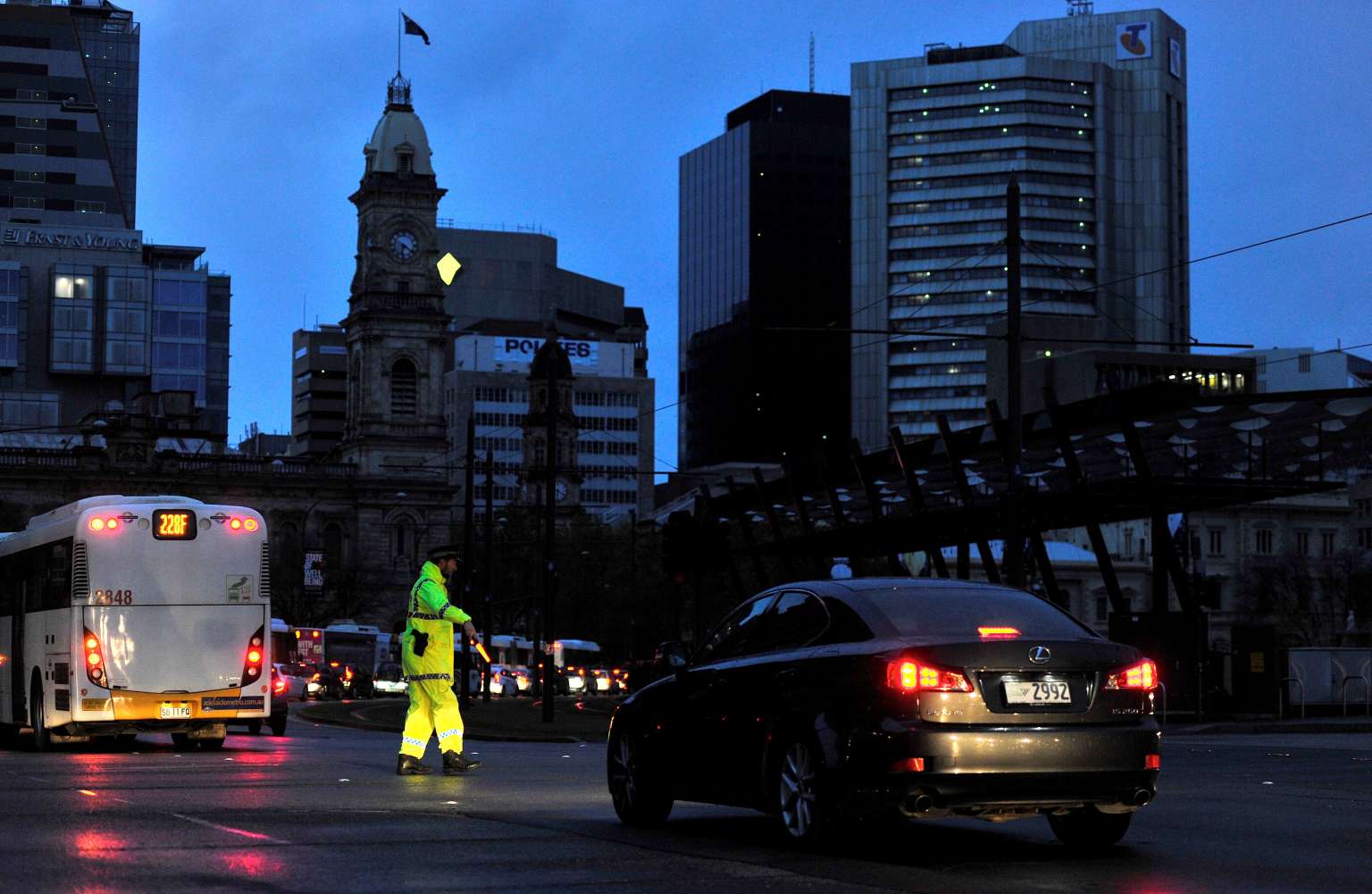 Police direct traffic in the central business district of Adelaide after severe storms and thousands of lightning strikes knocked out power to the entire state of South Australia on Sept 28.