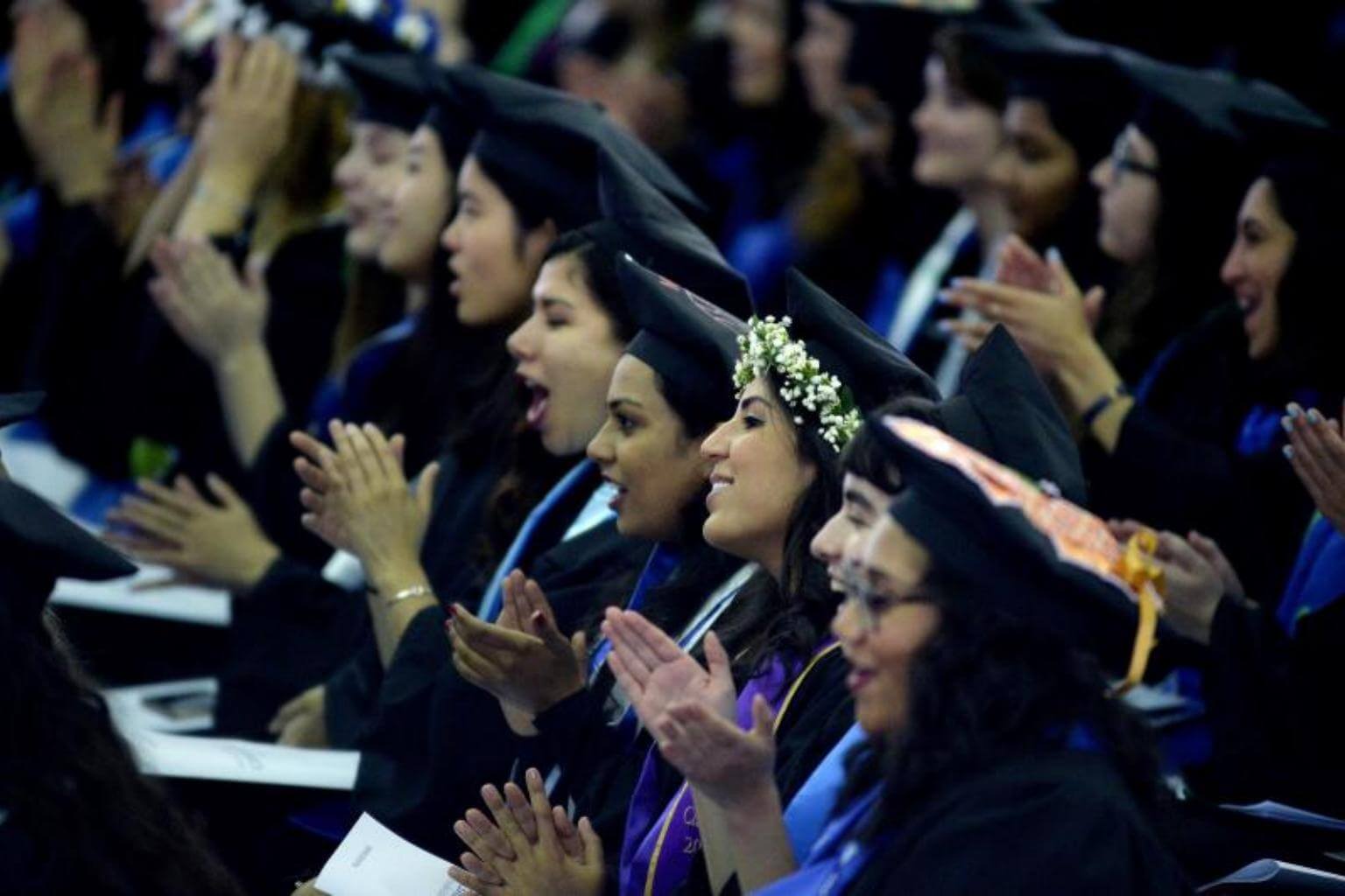 Students listen as Hillary Clinton speaks at commencement at Wellesley College on May 26, 2017 in Wellesley, Massachusetts.