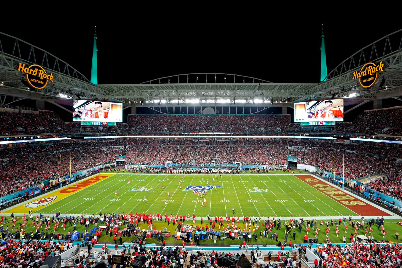 A view of the stadium during the opening kick of Super Bowl LIV between the San Francisco 49ers and the Kansas City Chiefs.