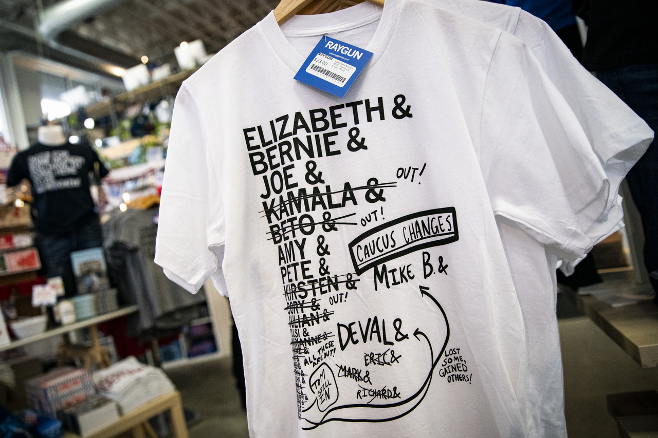 A caucus themed shirt hangs on display for sale at a store in Des Moines, Iowa, on Jan 30, 2020.