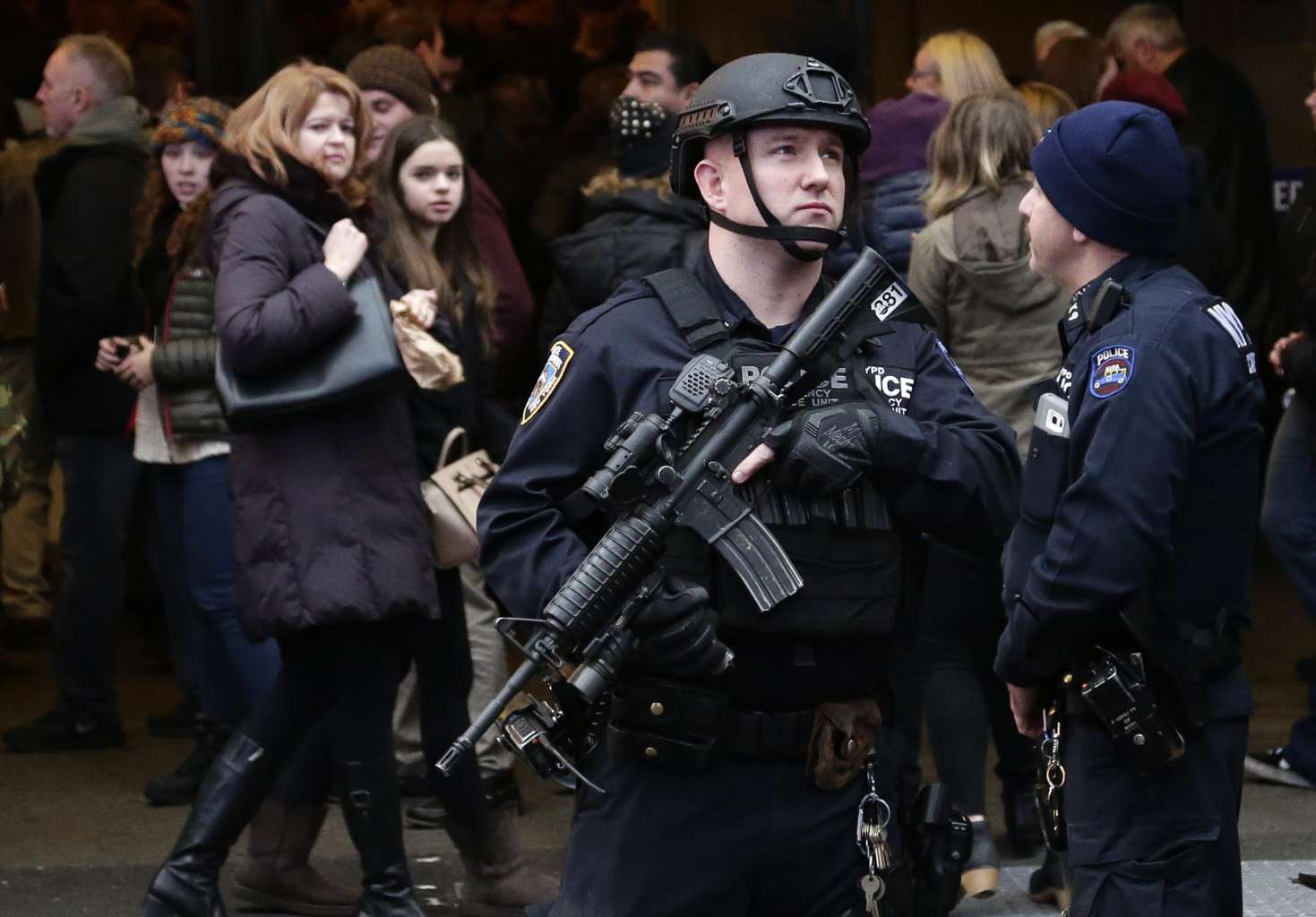 A member of the New York City Police department's Hercules team patrols in Times Square as crowds gather for New Year's Eve celebrations.