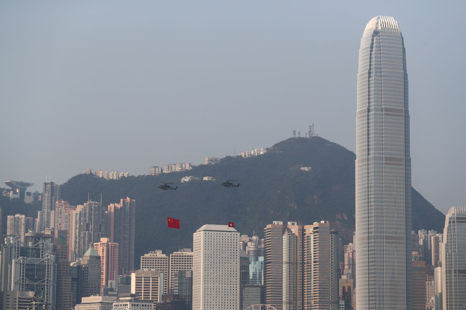 Helicopters on Oct 1 carrying China's national flag and Hong Kong's flag flying past the skyline of Victoria Harbour in Hong Kong on China's National Day. A push in the US Congress for legislation to support pro-democracy protests in Hong Kong and pressure China to refrain from a violent crackdown has faced obstacles.