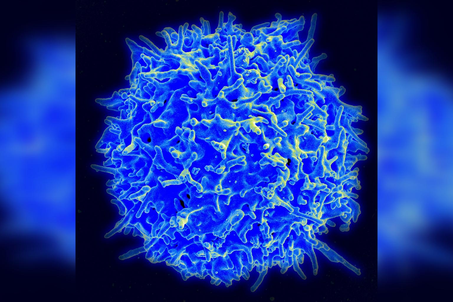 A scanning electron micrograph of a human T lymphocyte (T cell) from the immune system of a healthy donor.