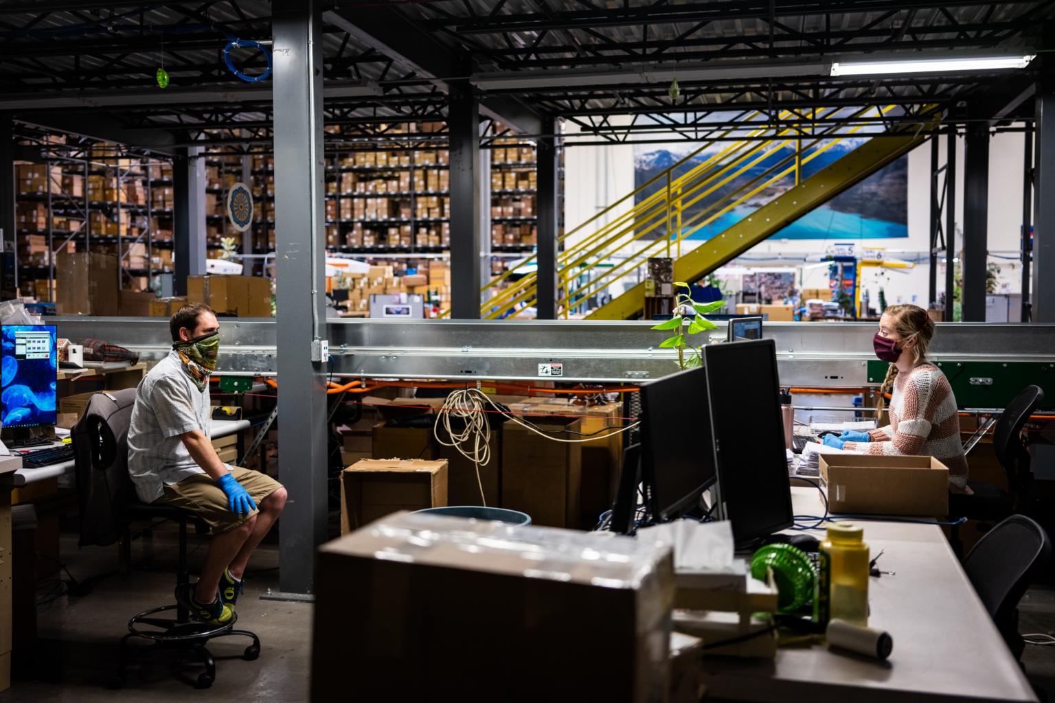 Workers maintain their distance while chatting in an office in Nevada on April 24, 2020.