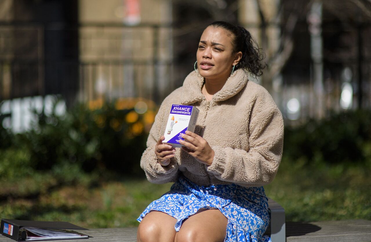 <p>Elizabeth Medina, a 38-year-old school guidance counselor, holds up a prescription nasal spray during an interview with AFP outside NewYork-Presbyterian Hospital on March 22, 2021 in New York City. - Three days after testing positive for Covid-19, "everything tasted like cardboard," recalls 38-year-old Elizabeth Medina, who lost her sense of taste and smell at the start of the pandemic. A year later, she fears she will never get them back. Medina consulted ear, nose and throat doctors and neurologists, tried various nasal sprays, and is part of a group of patients undergoing experimental treatment that uses fish oil. (Photo by Angela Weiss / AFP)</p>