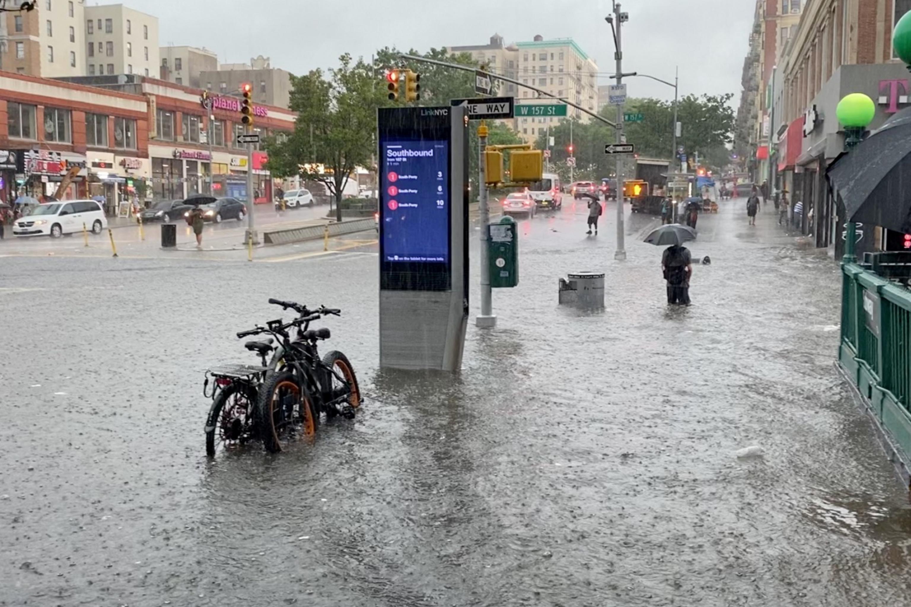 A person wades through the flood water near the 157th St. metro station in New York City, on July 8, 2021.