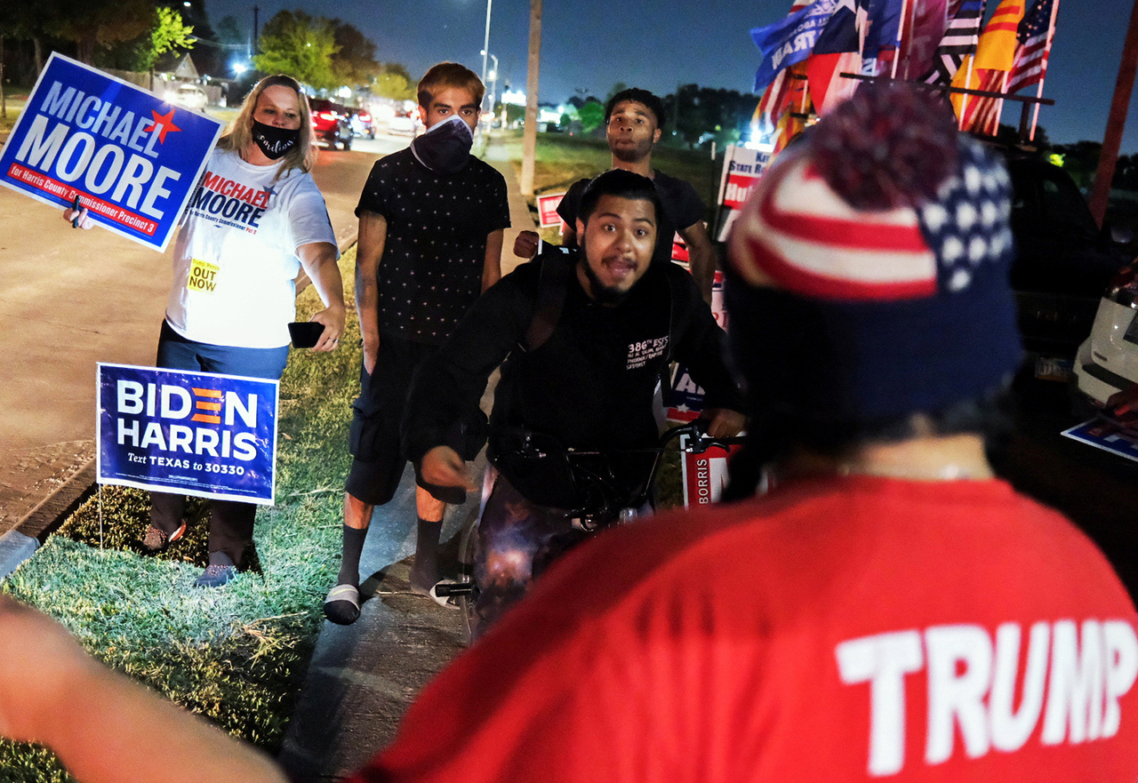 Biden supporters face off with a Trump supporter in Houston, Texas, on Nov 3, 2020.