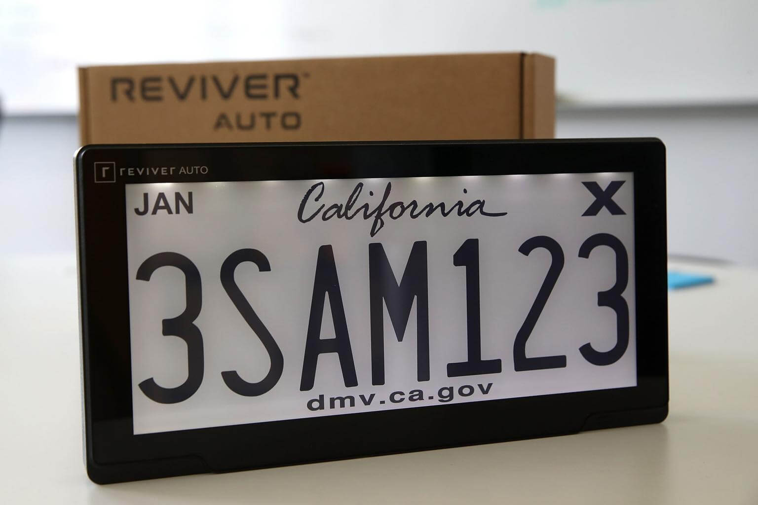 A digital license plate made by Bay Area company Reviver Auto is displayed at Reviver Auto headquarters in California, the first US state to test digital license plates on vehicles.