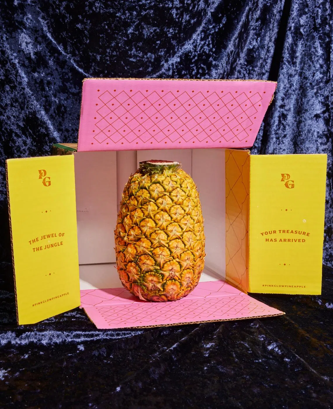 Speciality packaging for a Del Monte Pinkglow, a low-acidity pineapple grown in Costa Rica that sells whole for $16-28 each, depending on size, at Melissa’s Produce in Los Angeles.