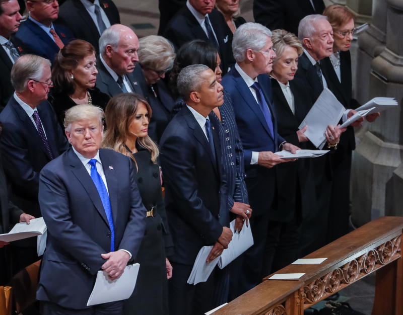 As a military honour guard carried Mr Bush's flag-draped coffin to rest in front of the altar, the Trumps joined the Obamas and Clintons in holding their right hands over their hearts.