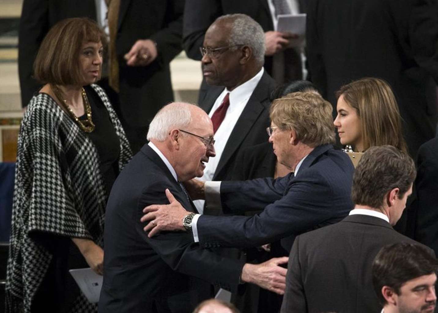Former US vice-president Dick Cheney (front, left) hugs former US Solicitor-General Theodore Olson (right) as they and Justice Clarence Thomas (top right) take their seats.