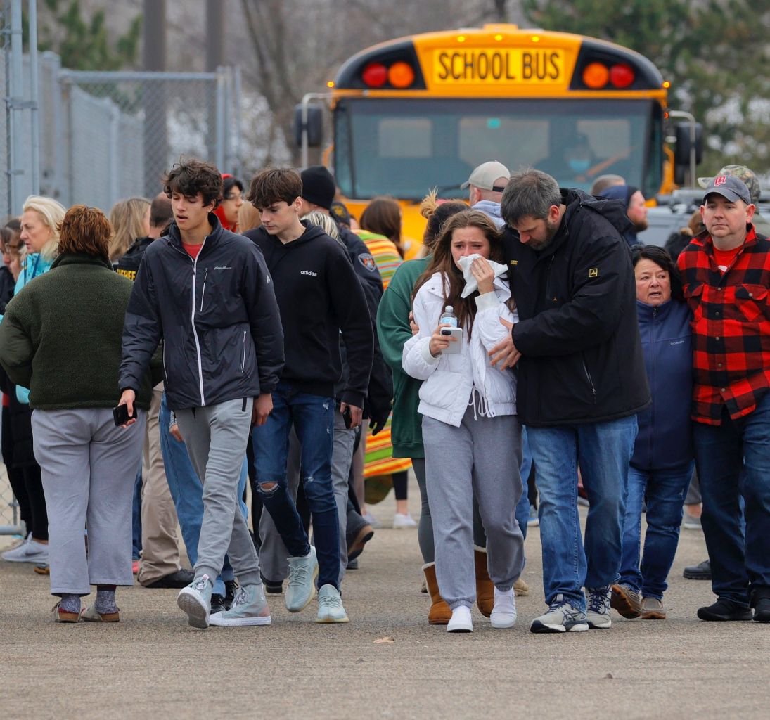 Students and their parents are pictured at the scene of the shooting at Oxford High School.