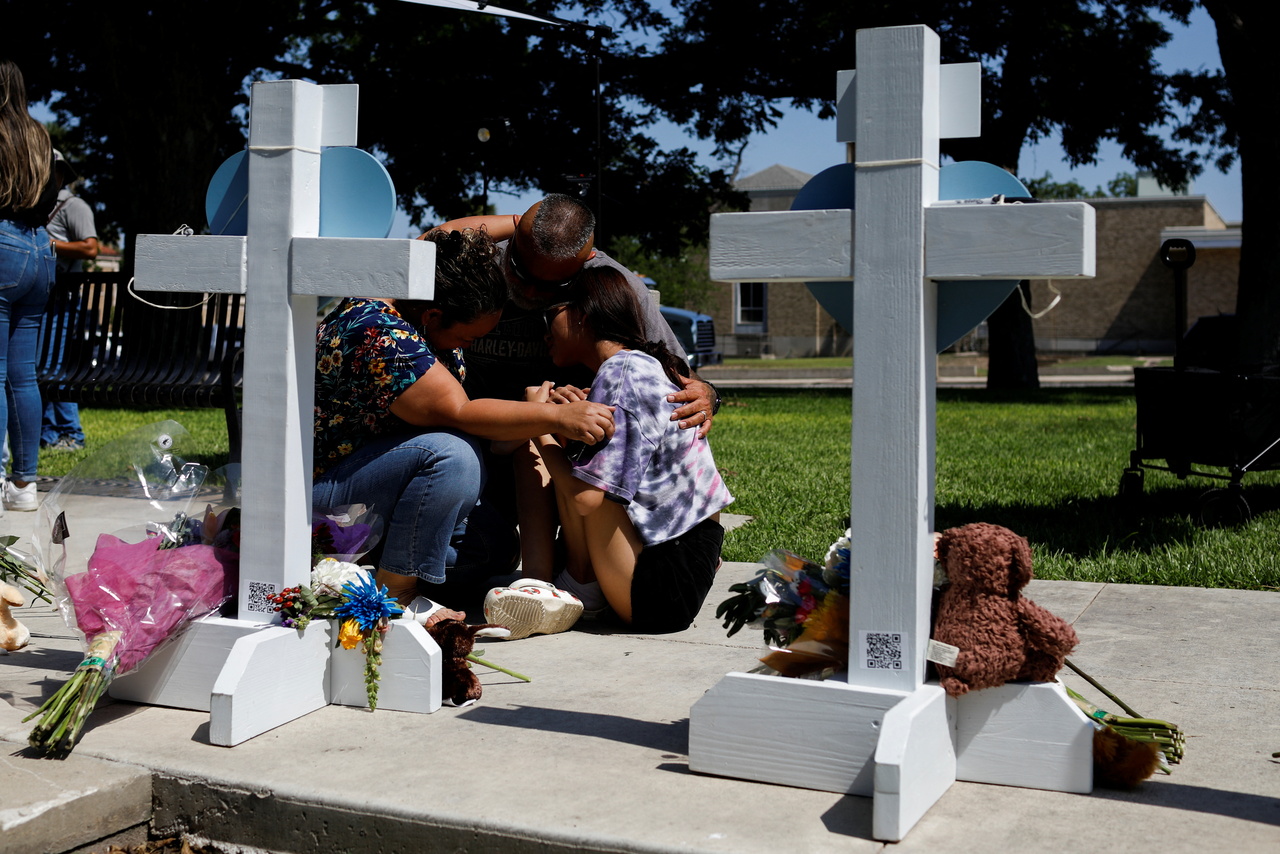 People react at a memorial for the victims, in Town Square in front of the county courthouse in Uvalde, Texas, on May 26, 2022.