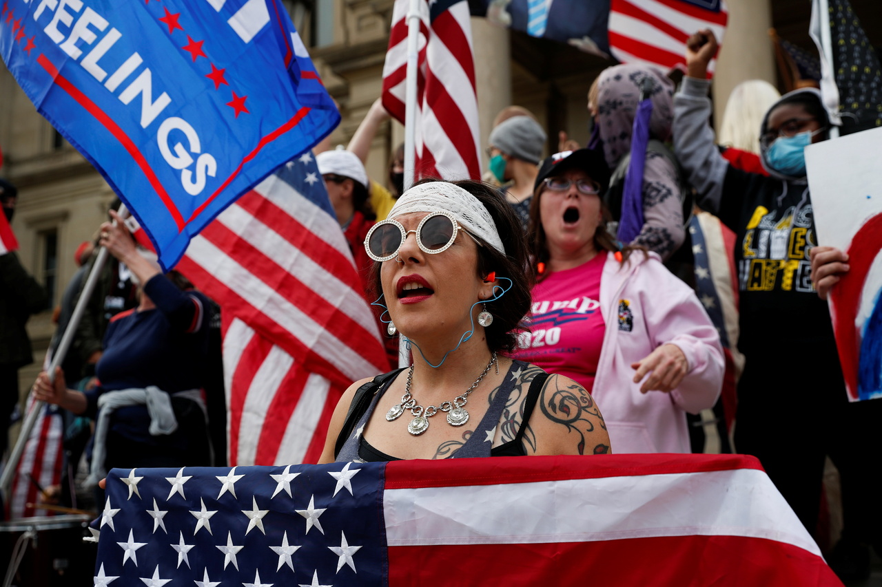 Protesters rally outside the State Capitol building after Mr Joe Biden was declared the winner of the US presidential election, in Lansing, Michigan, on Nov 8, 2020.