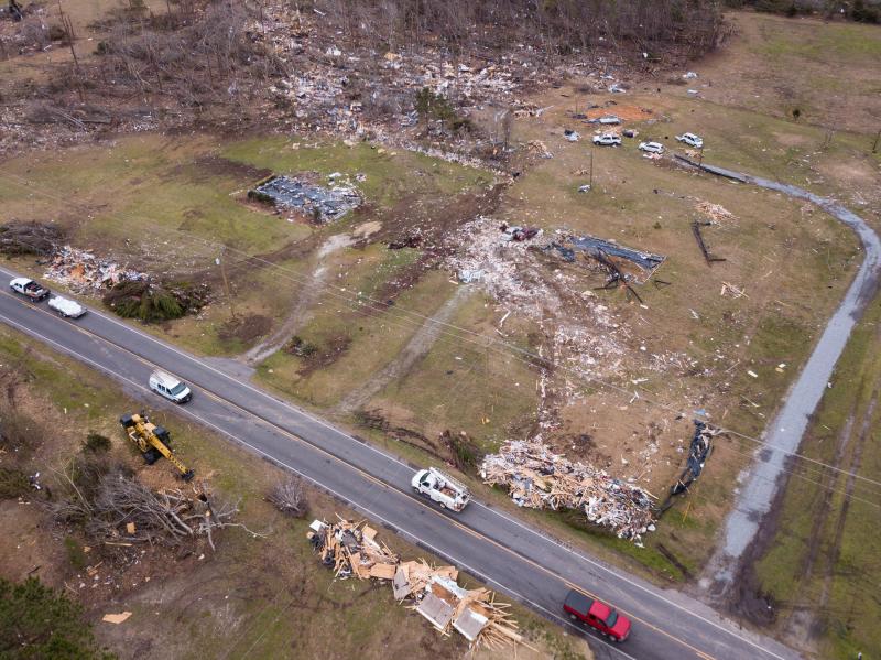 Damage is seen from a drone in the aftermath of an EF4 tornado in Beauregard, Alabama, on March 11, 2019.