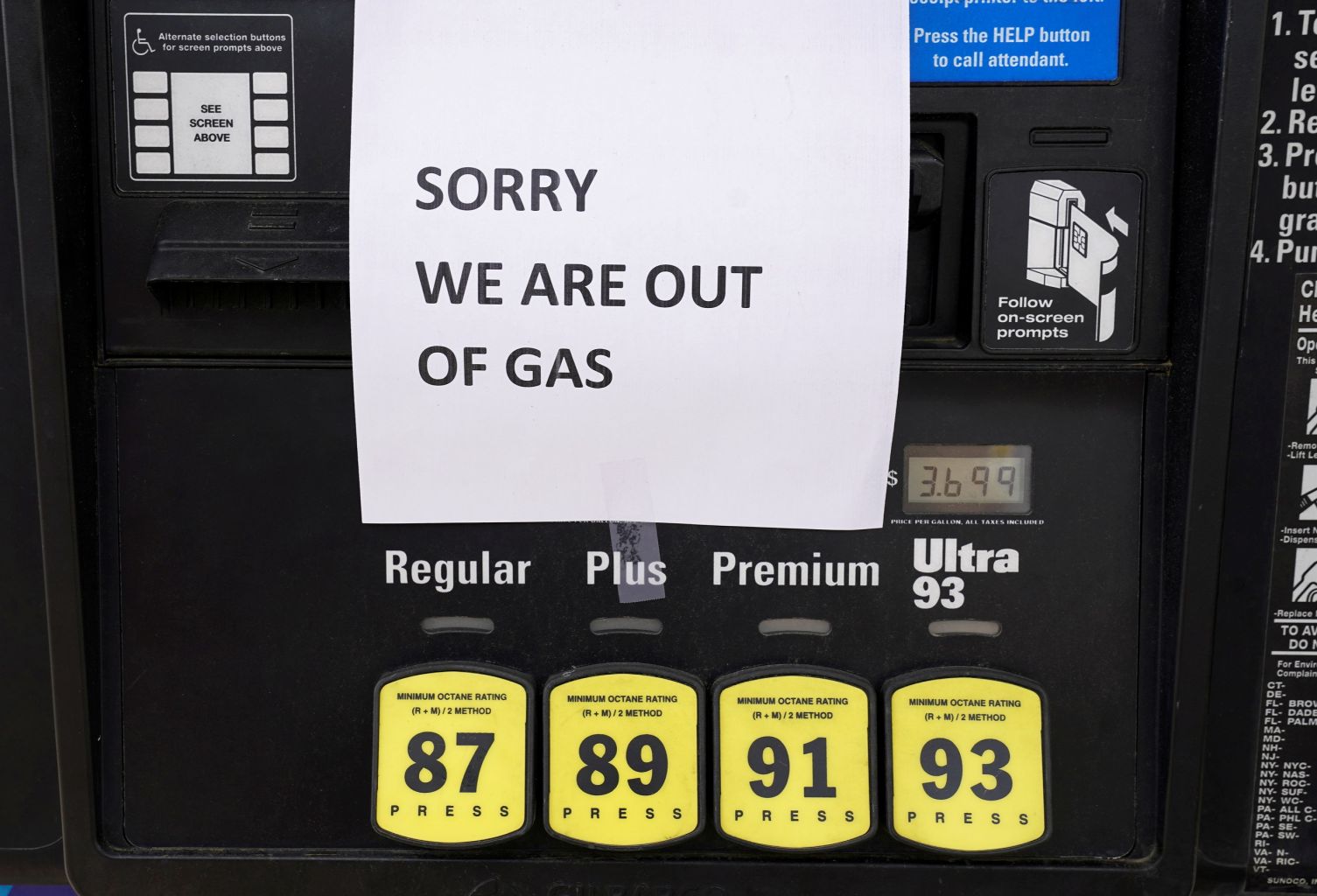 A sign tells drivers that fuel pumps are empty as people panic-buy, following the hacking attack on the Colonial Pipeline.