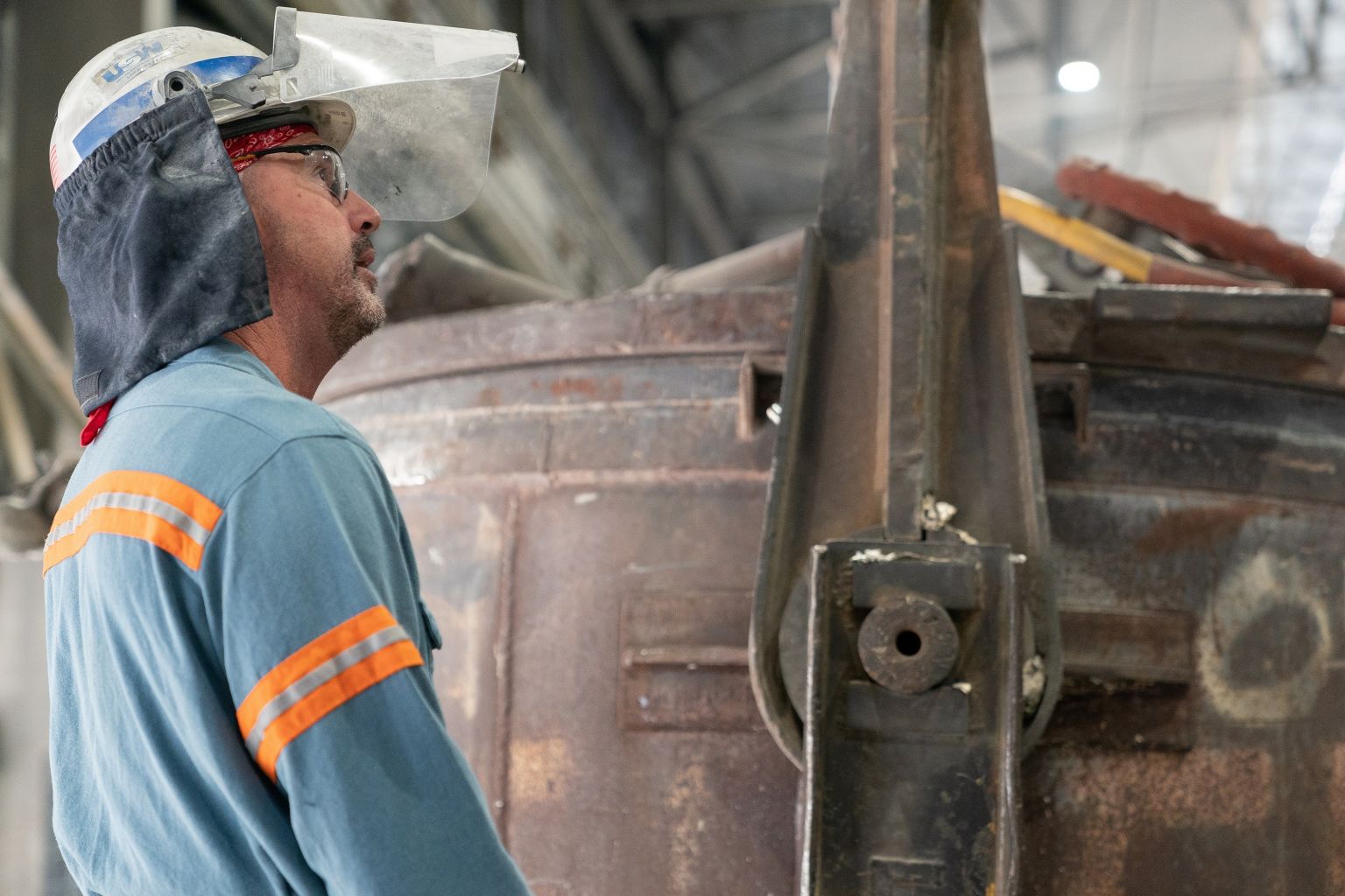 A metal worker operates a siphoning crucible at an aluminium foundry in the US state of Kentucky.