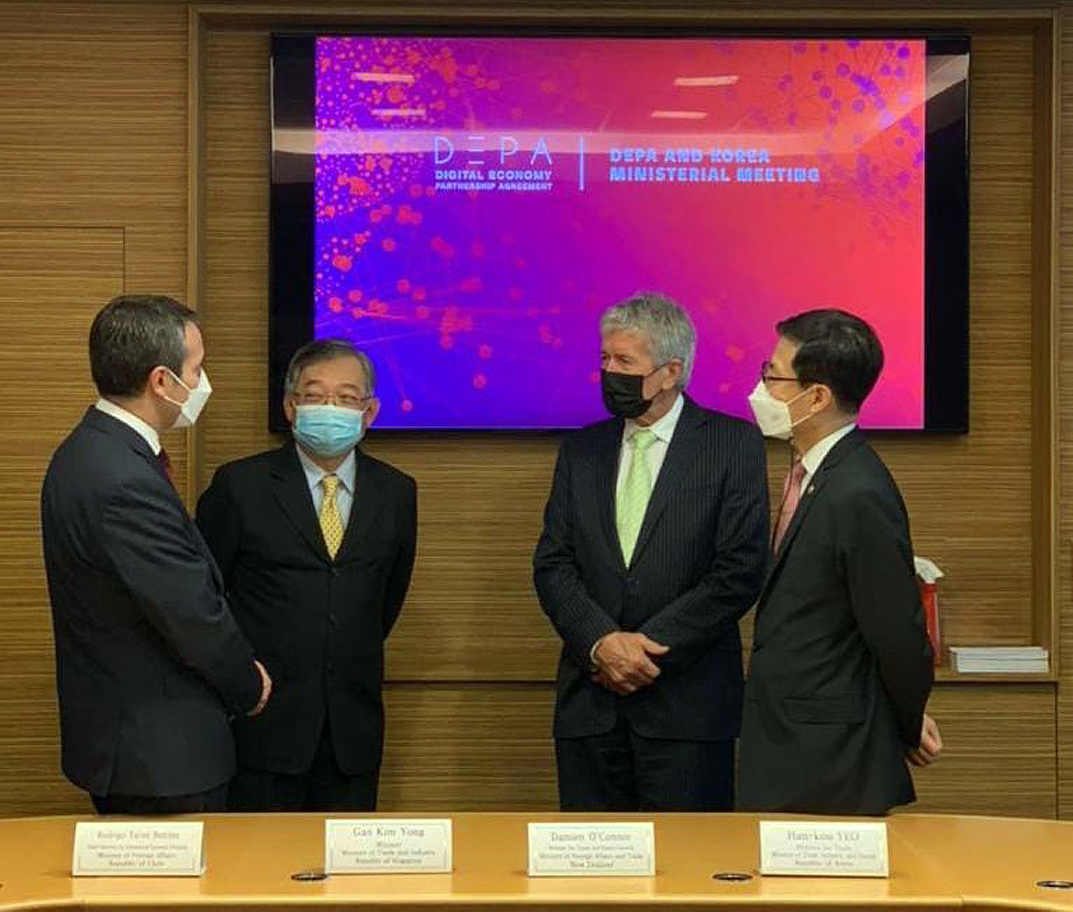 (From left) Chile’s Vice-Minister for Trade Rodrigo Yanez, Singapore’s Minister for Trade and Industry Gan Kim Yong, New Zealand’s Minister of Trade and Export Growth Damien O’Connor and South Korea’s Minister for Trade Yeo Han-koo meeting in Paris on Oct 5, 2021.
