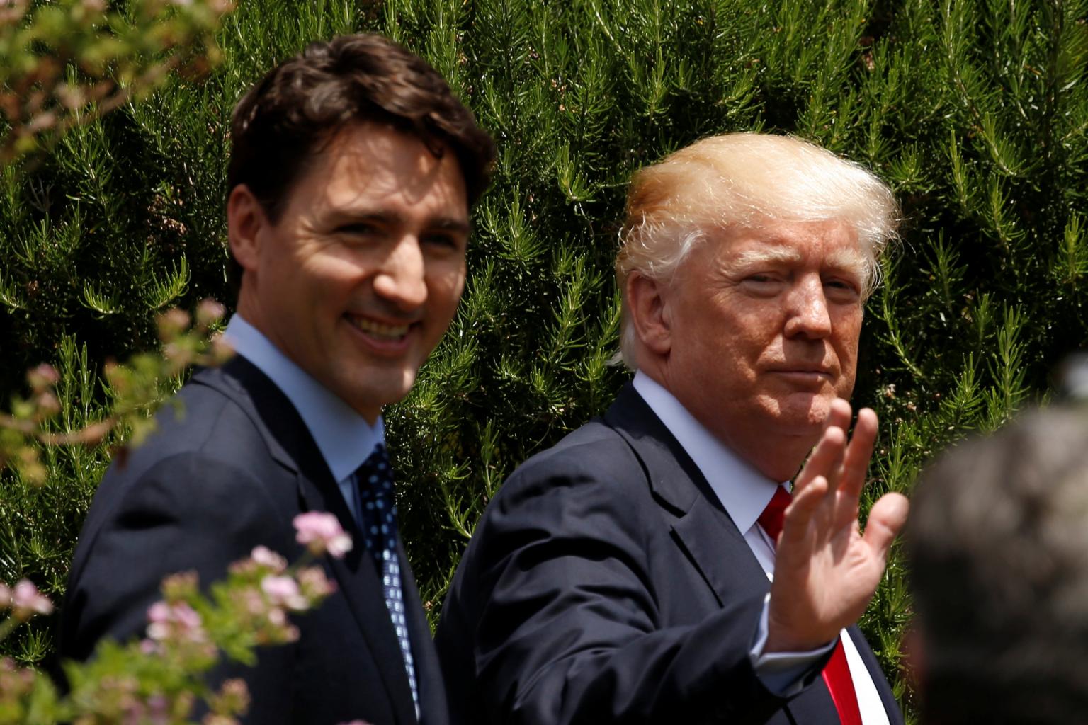 United States President Donald Trump waves next to Canadian Prime Minister Justin Trudeau, following a family photo at the G7 Summit expanded session in Taormina, Sicily, on May 27, 2017.