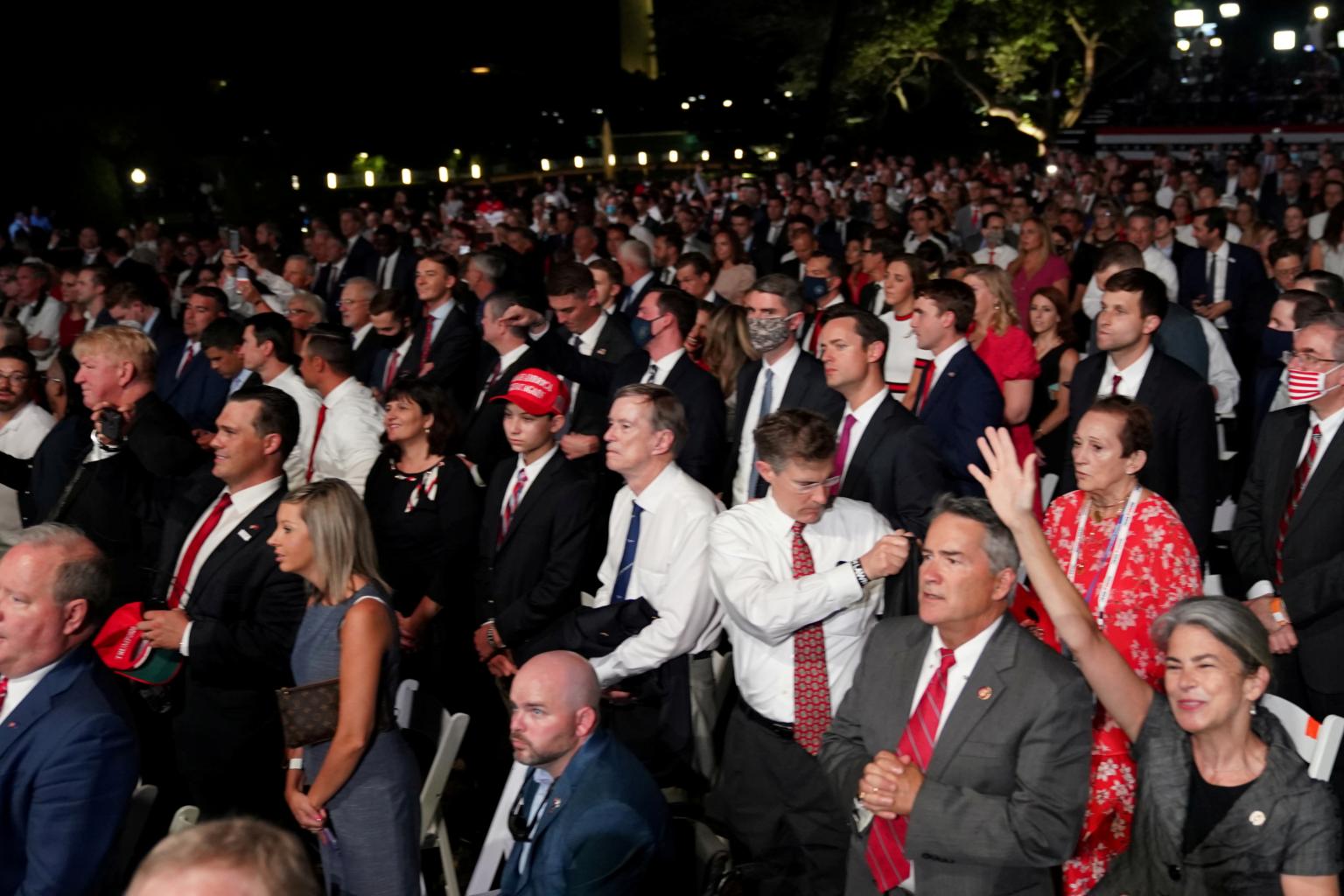 He spoke for over an hour in front of 1,500 largely maskless supporters seated close together in front of the White House, in line with his speech's efforts to portray America as well past the worst of the virus.