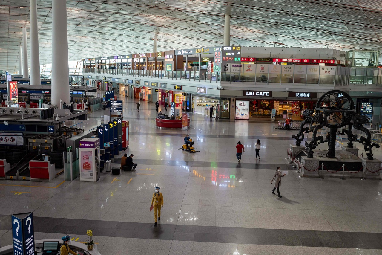 People at a terminal at Beijing Capital International Airport, on April 13, 2020.