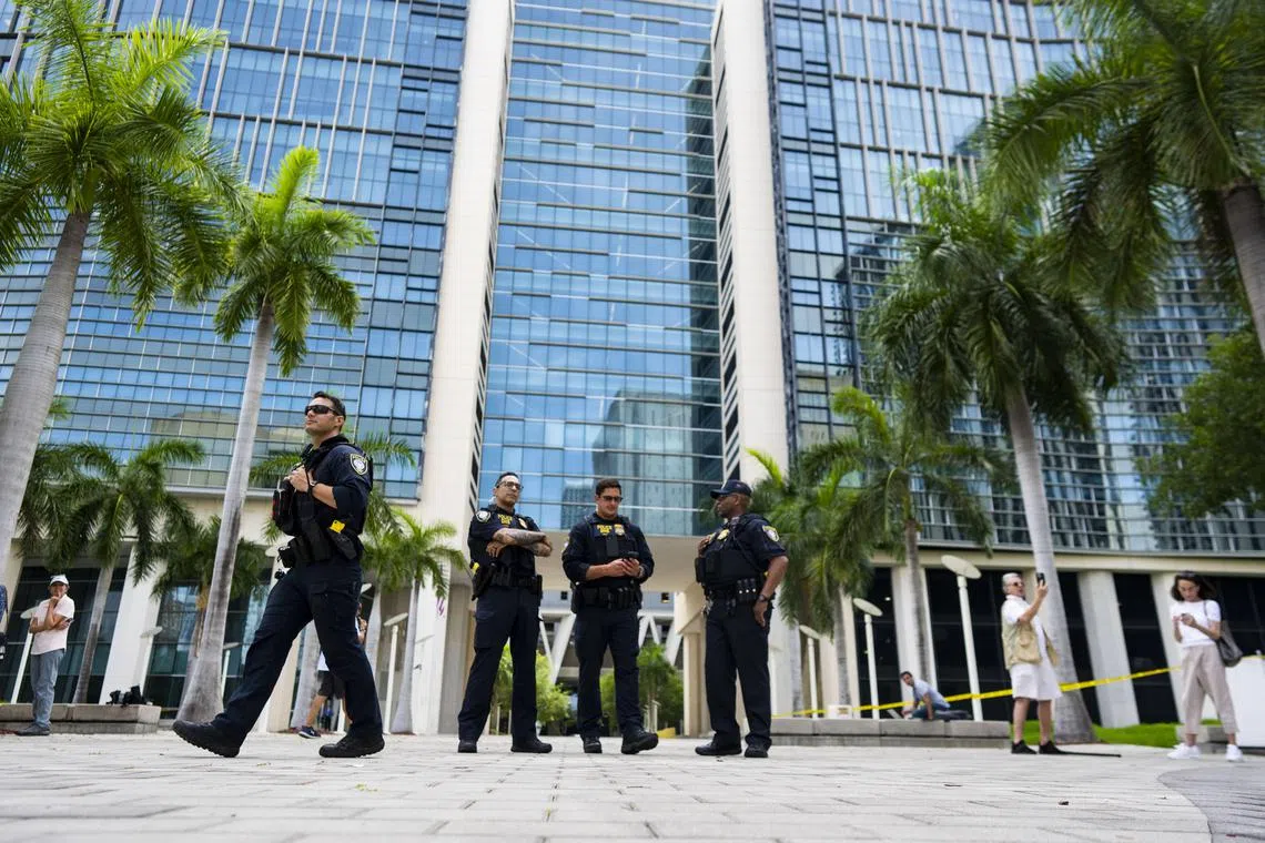 Police officers patrol outside the Wilkie D. Ferguson Jr. US Courthouse in Miami on Monday.