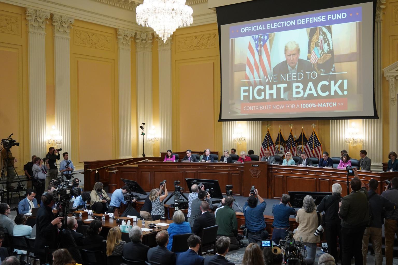 A video of former US president Donald Trump is seen during a hearing for the Capitol riot, on June 13, 2022.