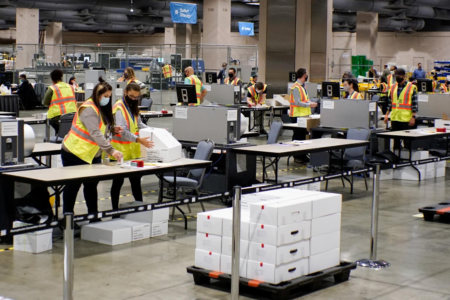 Electoral workers count ballots during the 2020 US presidential election in Philadelphia, Pennsylvania on Nov 3.
