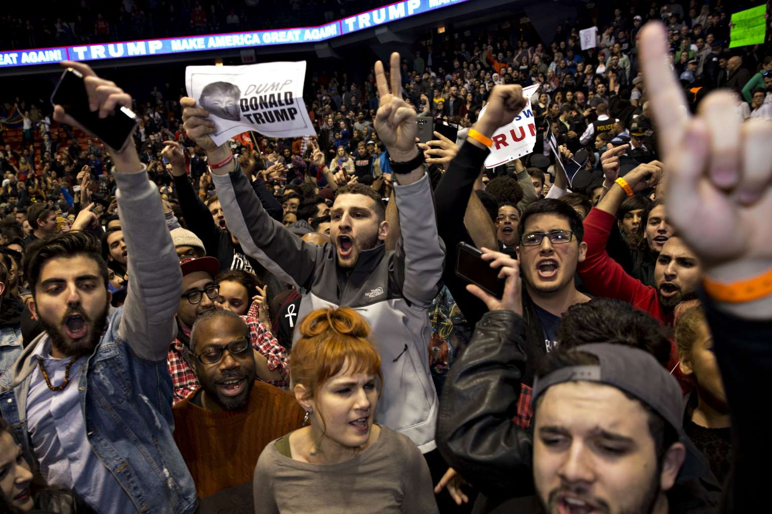 Demonstrators react after the cancellation of Trump's campaign event in Chicago, Illinois, on March 11, 2016.