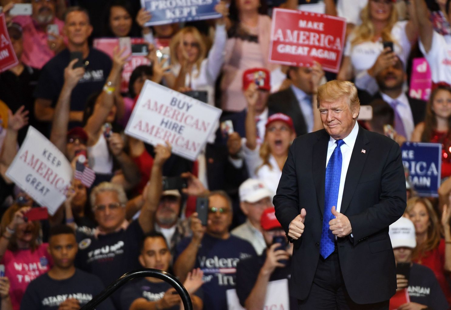 Trump gestures as he walks onstage for a campaign rally on Sept 20, 2018 in Las Vegas, Nevada.