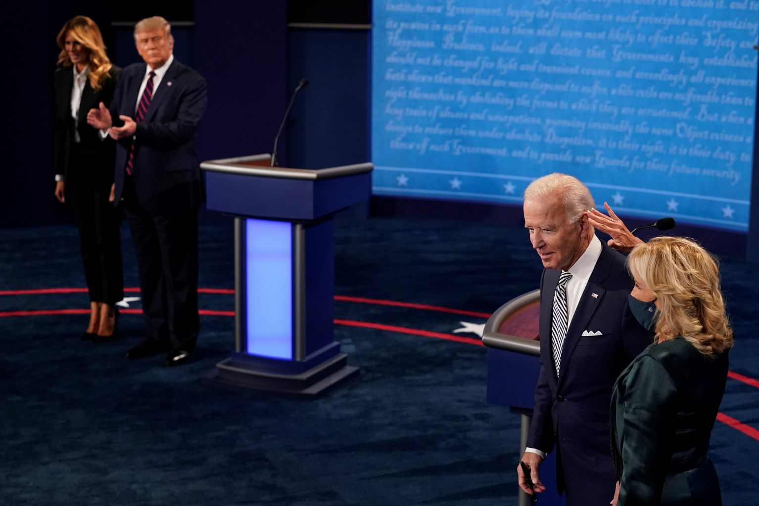 Melania Trump stands with President Donald Trump, as he looks at Joe Biden and his wife Jill, during the first presidential debate.