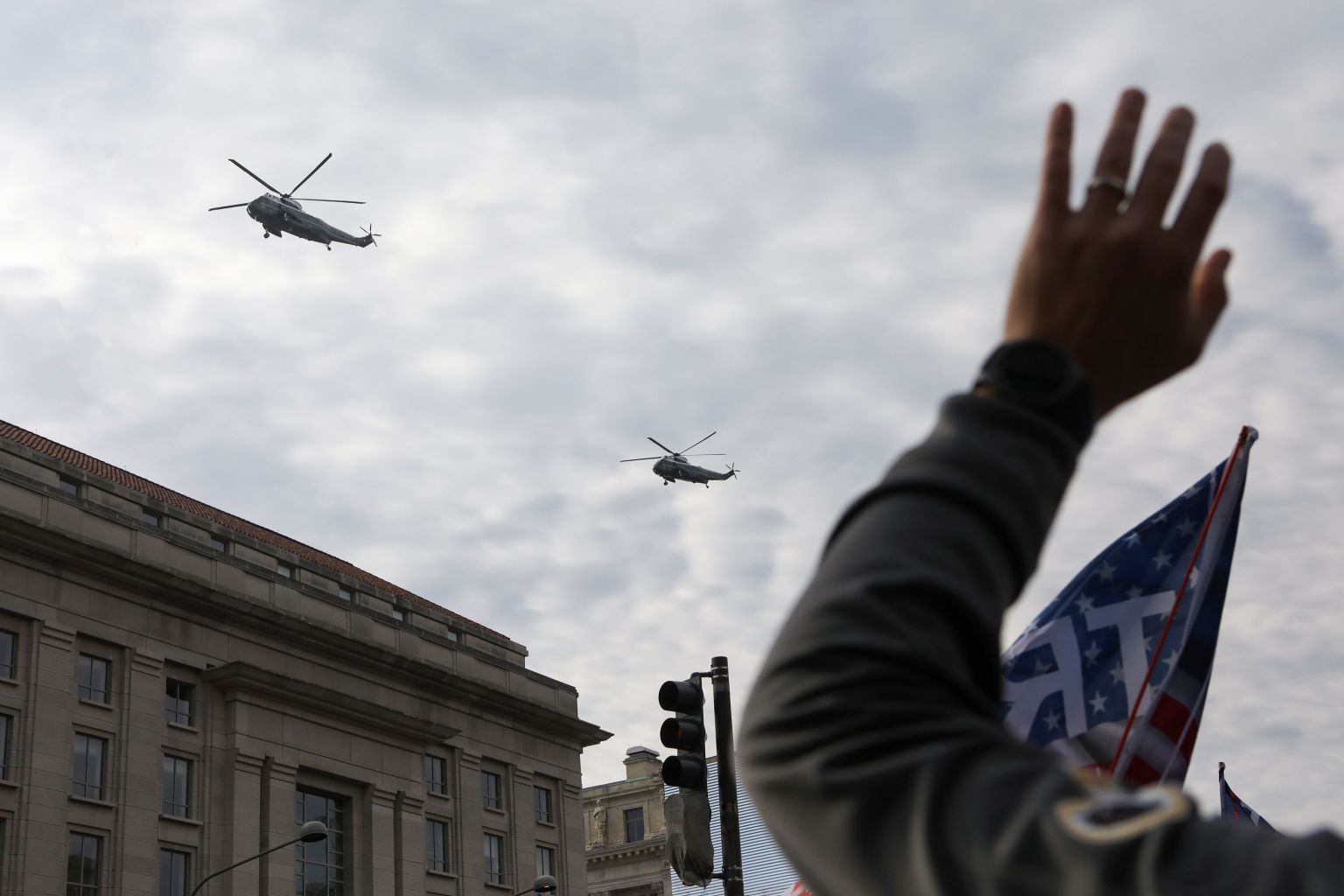 Fox News showed Marine One, the presidential helicopter, flying over the march en route to Joint Base Andrews, from where Trump flew to West Point, New York, to attend the annual Army-Navy football game.